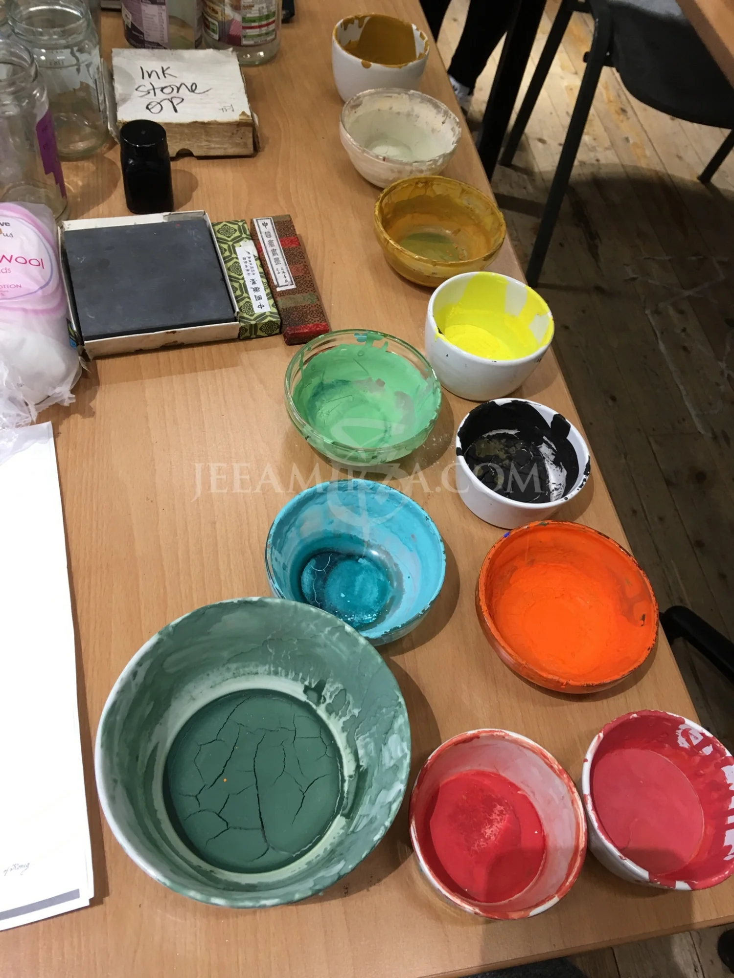 Once the paint had been tested and we were satisfied with the consistency and gum content we used a palette knife to scrape up the paint and transferred it into small bowls. When the paint dries out in these bowls it can be reconstituted by adding water and giving it a good mix. Once re-constituted it is important to swatch and re-test the paint as each time water is added it dilutes the gum content and you may need to add an extra drop or two into the bowl.