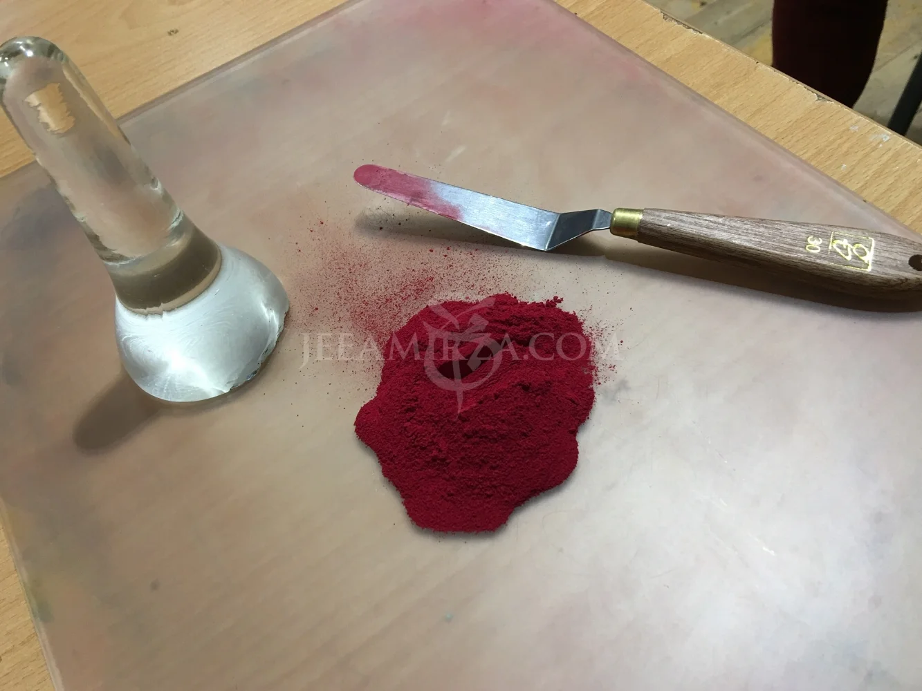 Alizarin Crimson pigment shown next to a glass muller and palette knife