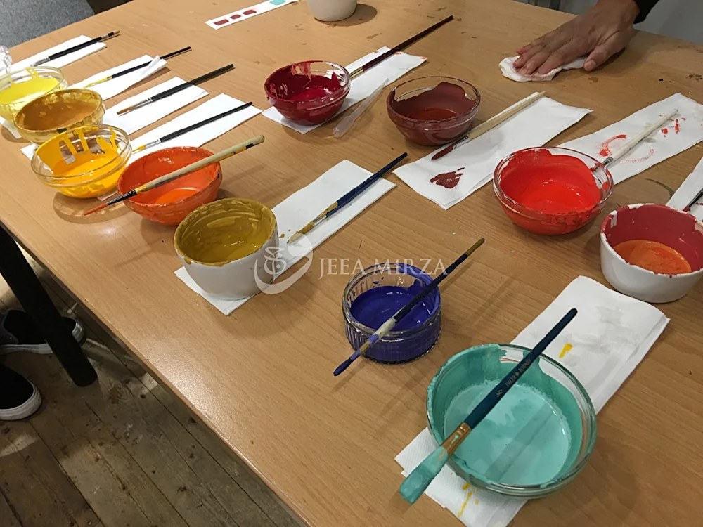 Day 2 of the course at the Prince's School (11th of November) took off in an almost literal burst of colour as Sam started to unpack and layout the powdery pigments and dishes of paint that we would spend the day working with. We all crowded round the desk laden with colour just waiting for the chance to jump in!